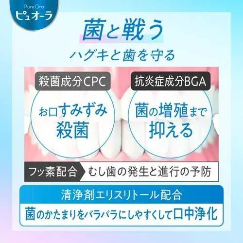 Purification power for the future. Purifies all stickiness, even the population of bacteria. Bacteria-killing ingredient CPC (Cetylpyridinium chloride) thoroughly kills pathogenic bacteria and prevents bad breath and cavities. Contains fluoride. Purifying ingredient erythritol quickly penetrates into the population of bacteria (impurities inside mouth, including bacteria) to make them disperse easier and purifies inside your mouth. Keeps the inside of your mouth comfortable and healthy. Formulated to melt and spread throughout your mouth. Crisp Clean Mint Flavor (Quasi-drug)