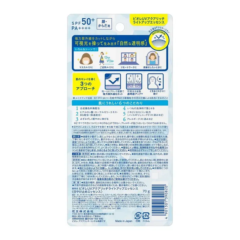 1. Blocks powerful UV rays (SPF50+/PA++++) while creating natural translucency by adjusting visible light. Prevents risk of skin appearing dull