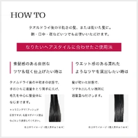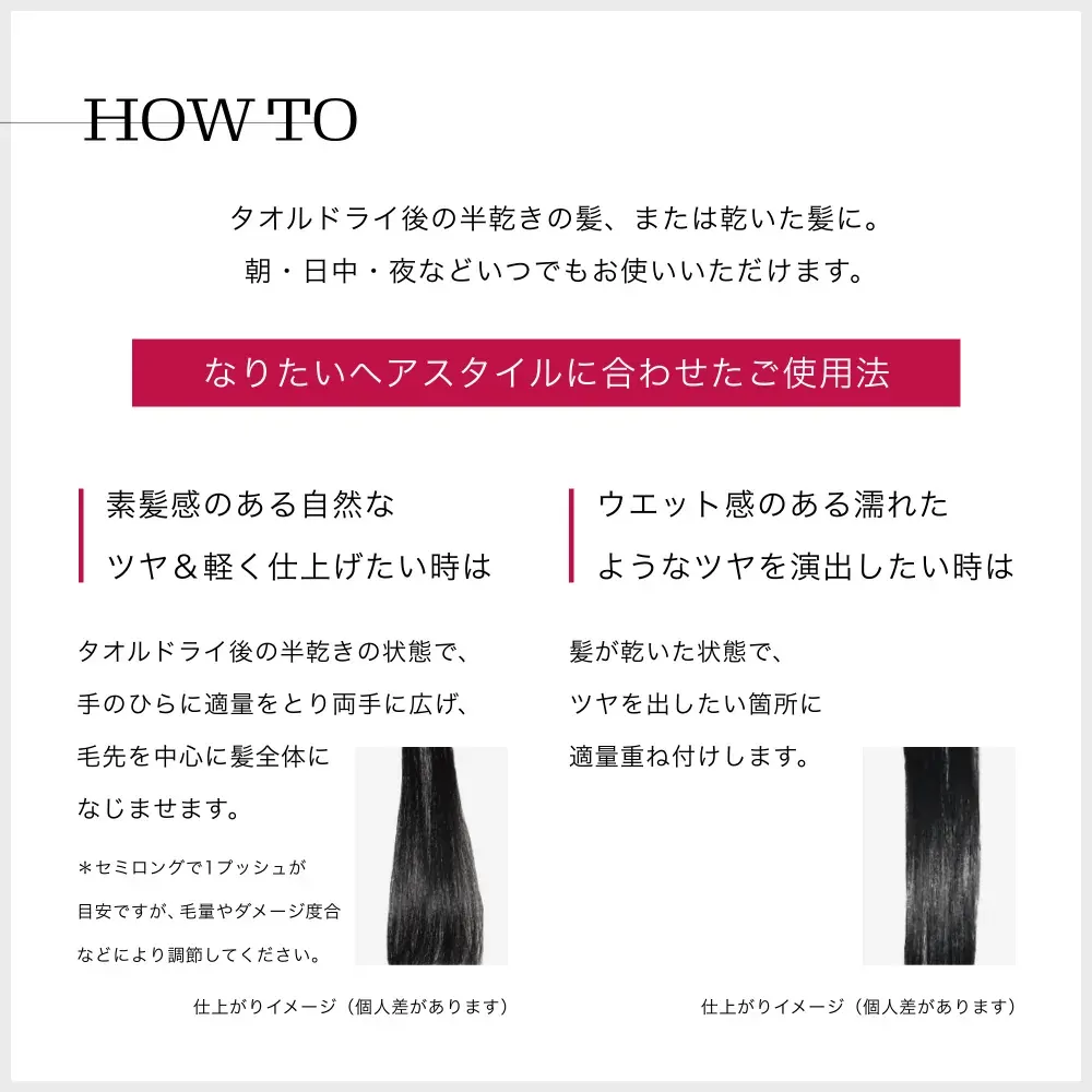 For semi-dry or dry hair after towel drying. Can be used any time of the day, morning, noon or night. For a natural shine and light finish, apply an appropriate amount to semi-dry hair after towel-drying, spread onto both hands and apply to the entire hair, focusing on the ends. (One push is a rough guide for semi-long hair, but adjust according to the amount of hair and degree of damage.) For a wet look, apply an appropriate amount to the area you want to make shiny while your hair is dry.