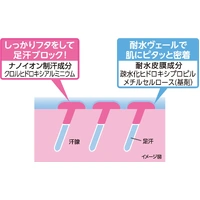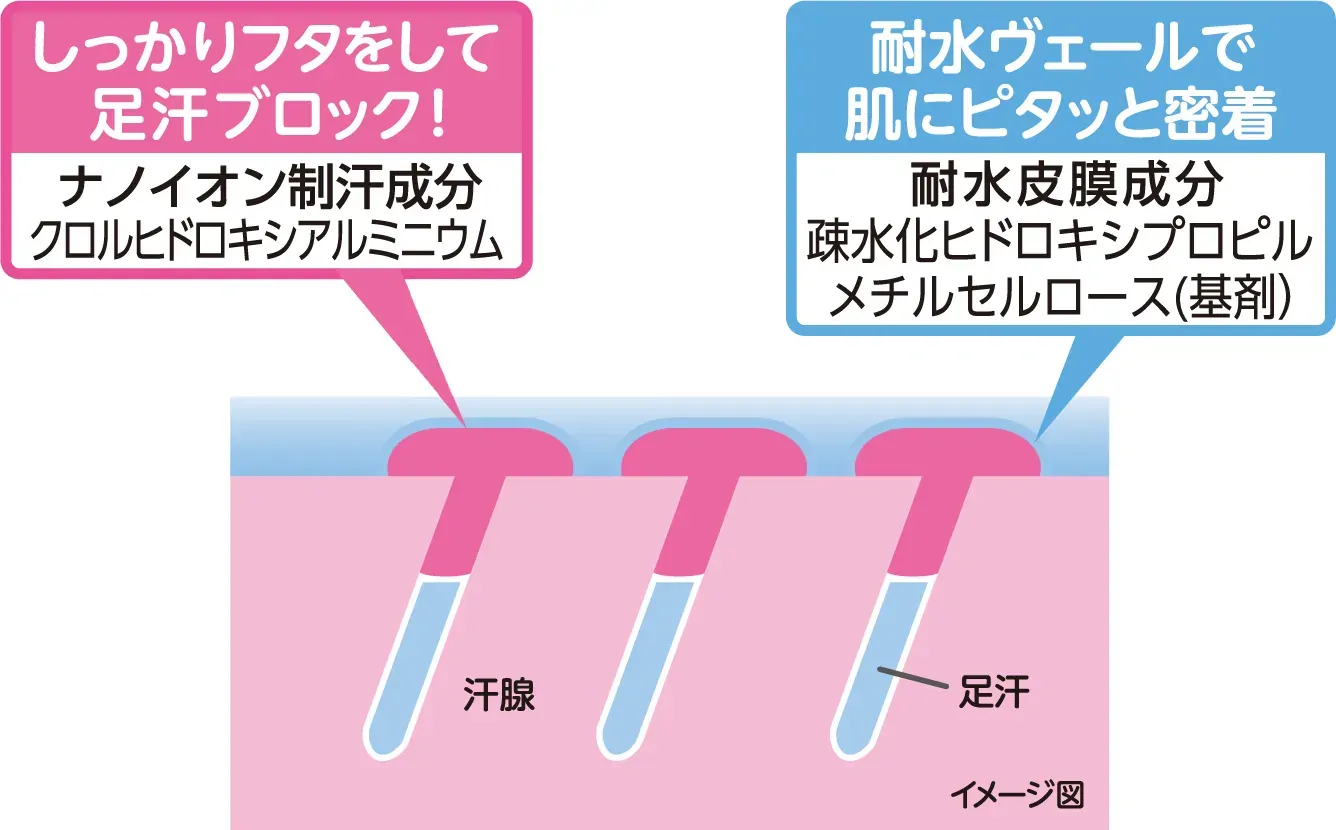 1 water-resistant film ingredients closely adhere to the skin. The nano ion antiperspirant ingredient covers the outlet of foot sweat to suppress foot sweat before it comes out, which causes odors and stuffiness.