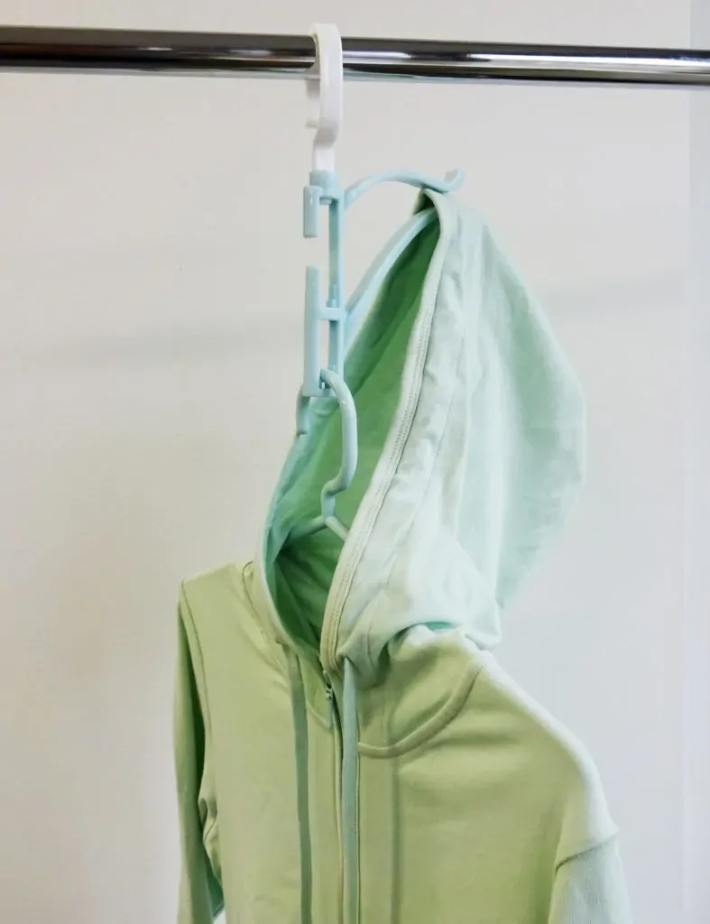 Place the hoodie on another drying hanger and insert the hook into the hole of the "hoodie hanger".