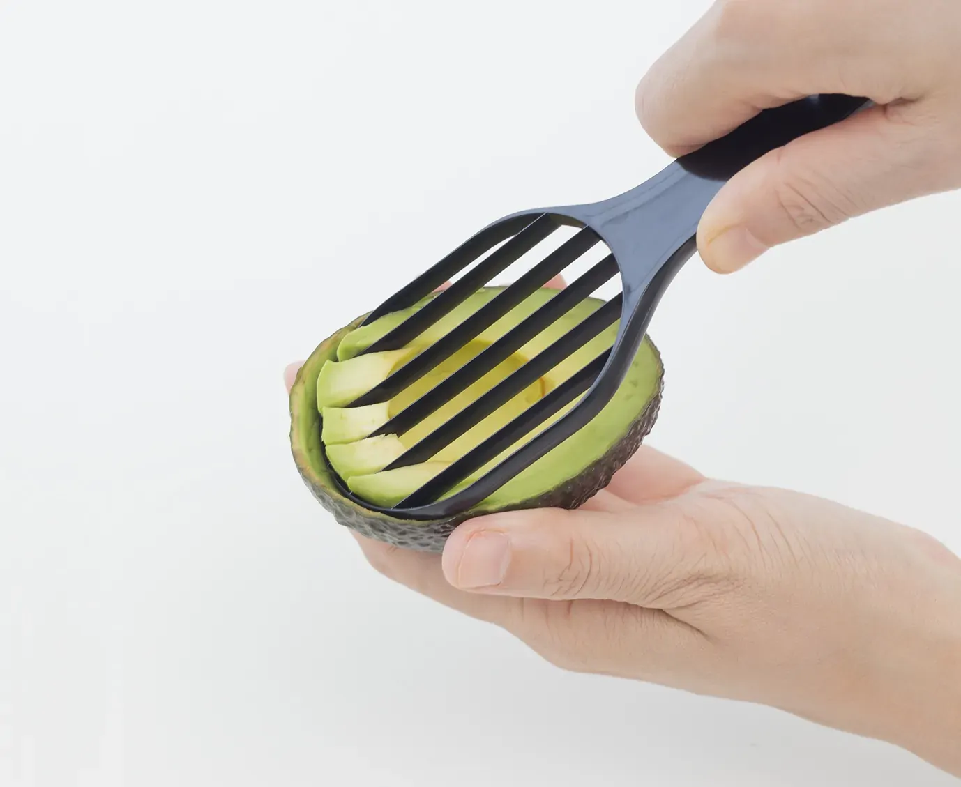 Cut it in half lengthwise, remove the seeds, insert the slicer tip into the avocado