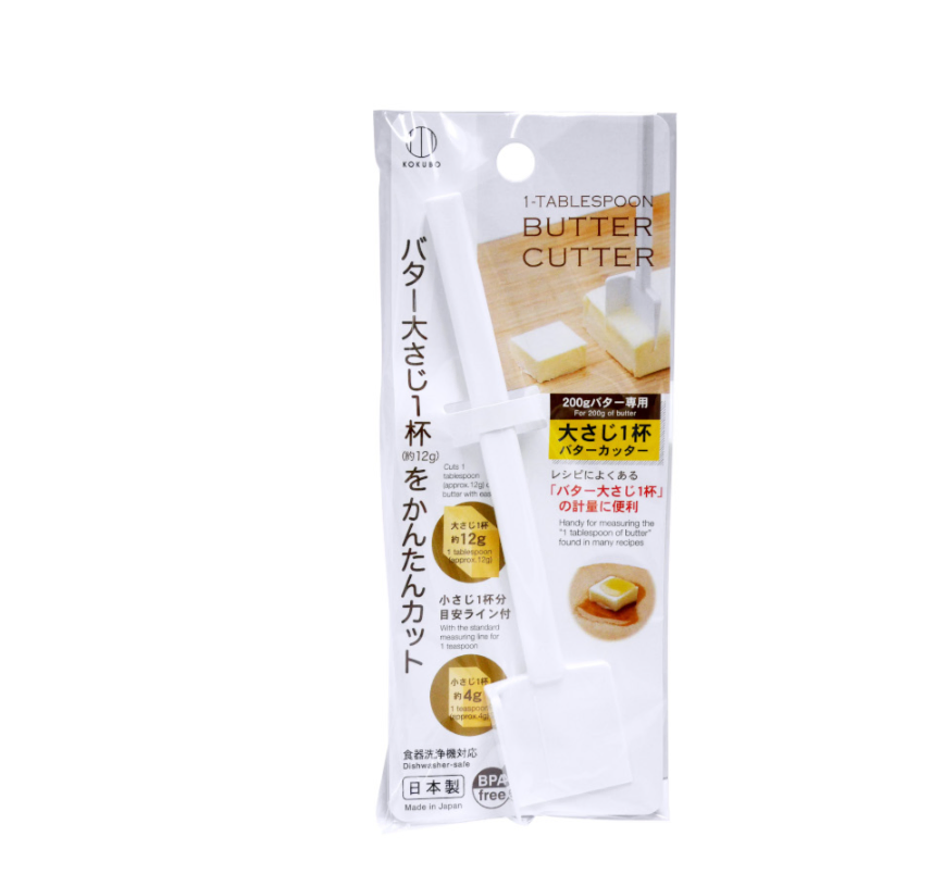 A plastic cutter that cuts solid butter into chunks, usually used for toast or pancakes. Can be used for cooking and candy making. Recipes often say "1 tablespoon of butter," but butter is actually very hard, so it's not suitable for measuring spoons. It's easy to get confused. With this cutter, you can easily weigh 1 tablespoon (about 12 grams). Mix the edges of the butter into the lines of the cutter for 1 teaspoon (about 4 grams).