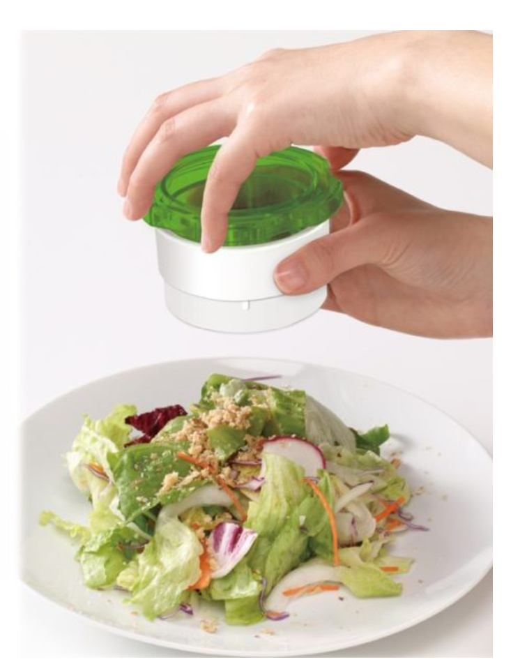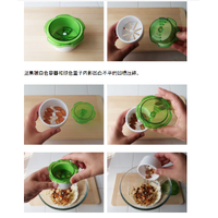 Place the nuts in a white container, cover with a green lid, press down from the top and twist to break them into pieces. The grooves in the container and lid hit the nut, becoming thinner and falling out of the bottom hole. If you bump into the food, you can add it as is. You can easily add nuts to salads, pilaf, curries, yogurt, ice cream, pancakes, and drinks. You can enjoy it in delicious style.