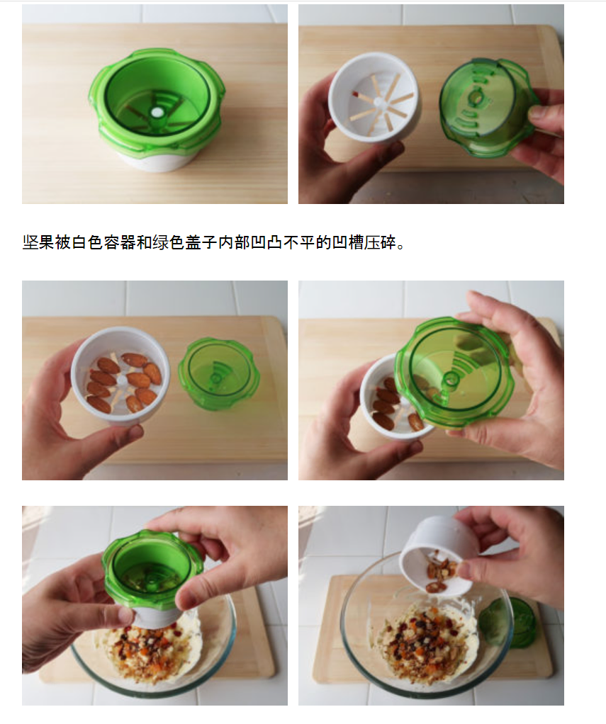 Usage: Crush the nut with the concave surface inside the white container and green lid.