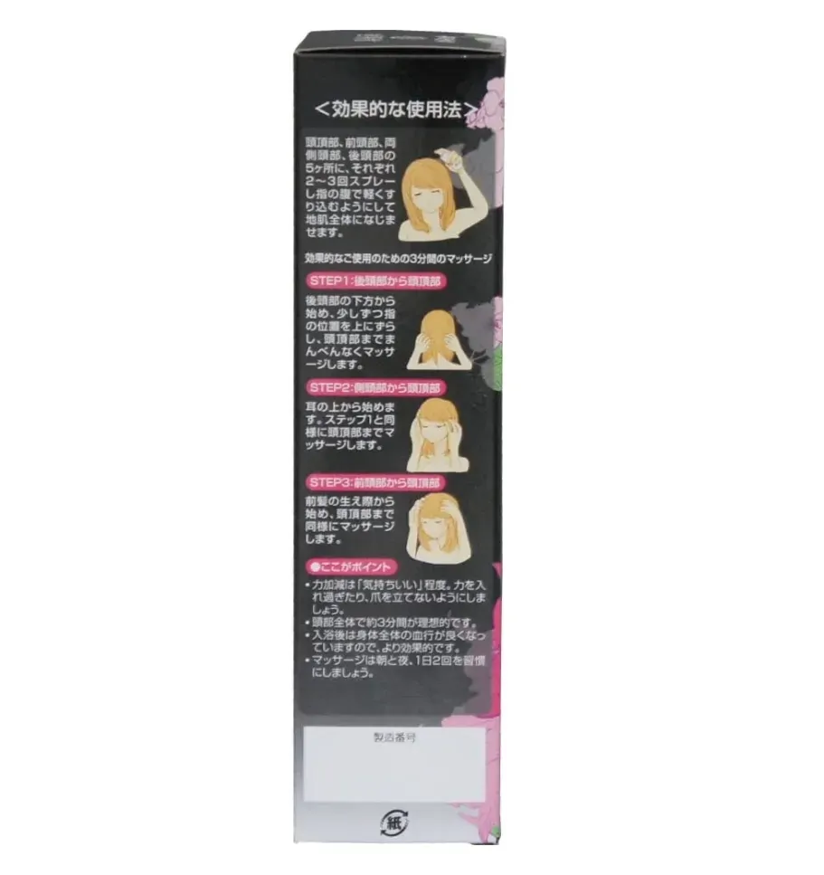 Spray 2-3 times each on the top of the head, front of the head, both sides of the head, and back of the head, and rub lightly with the pads of your fingers to blend it into the entire scalp.