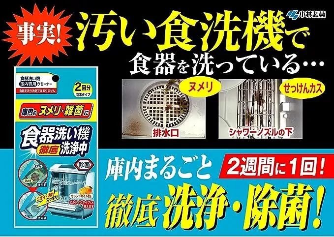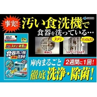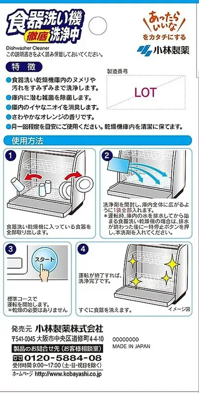 (1) Remove all dishes from the dishwasher. (2) Open the cleaning agent and put the whole bag so that it spreads throughout the inside of the cabinet.