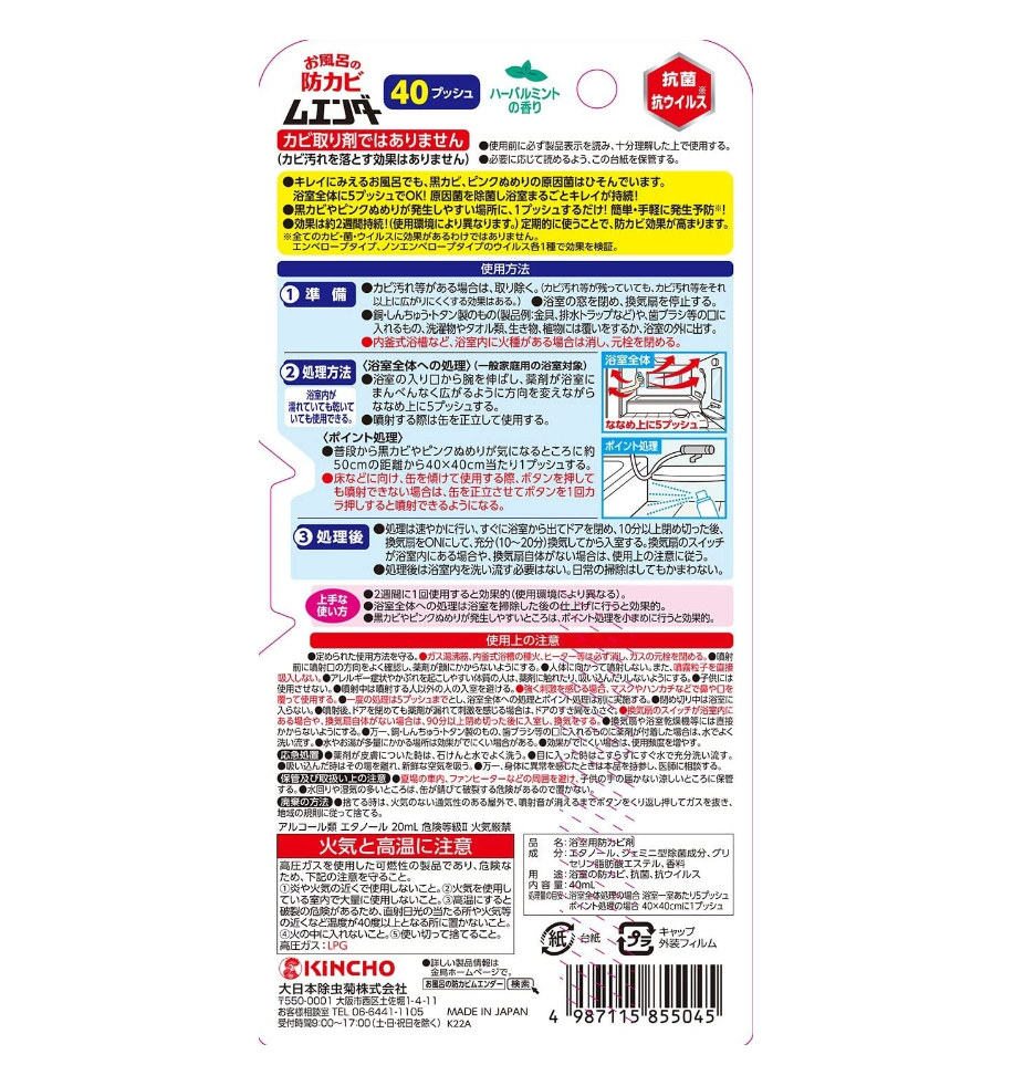 Mildew resistant in bath. Easy to push You can use 5 pushes to the space once every 2 weeks. Prevents mold and mildew from the entire bathroom (disinfecting and mildew due to repeated treatment of "treatment for the whole bathroom" and "point processing"). Antibacterial and antivirus *. Kills bacteria that cause black mold. Point treatment for those concerns. Also prevents pink slime. Easy, clean smokeless formula Herbal Mint Scent Not mildew remover. (It does not remove mold stains) Even if you are looking to clean baths, you can still use the bacteria that causes black mold and pink slime. You can only use 5 pushes to complete the bathroom. It disinfects bacteria that cause bacteria and keeps your bathroom clean. Just push one button in a place where black mold and pink slimes are prone to occur. Easy and easy to prevent occurrence *The effect will last about 2 weeks! (Varies depending on usage environment. Regular use will increase mold resistance Not effective on all mold, bacteria, and viruses. Validate the effect with one envelope and one non-envelope type virus.
