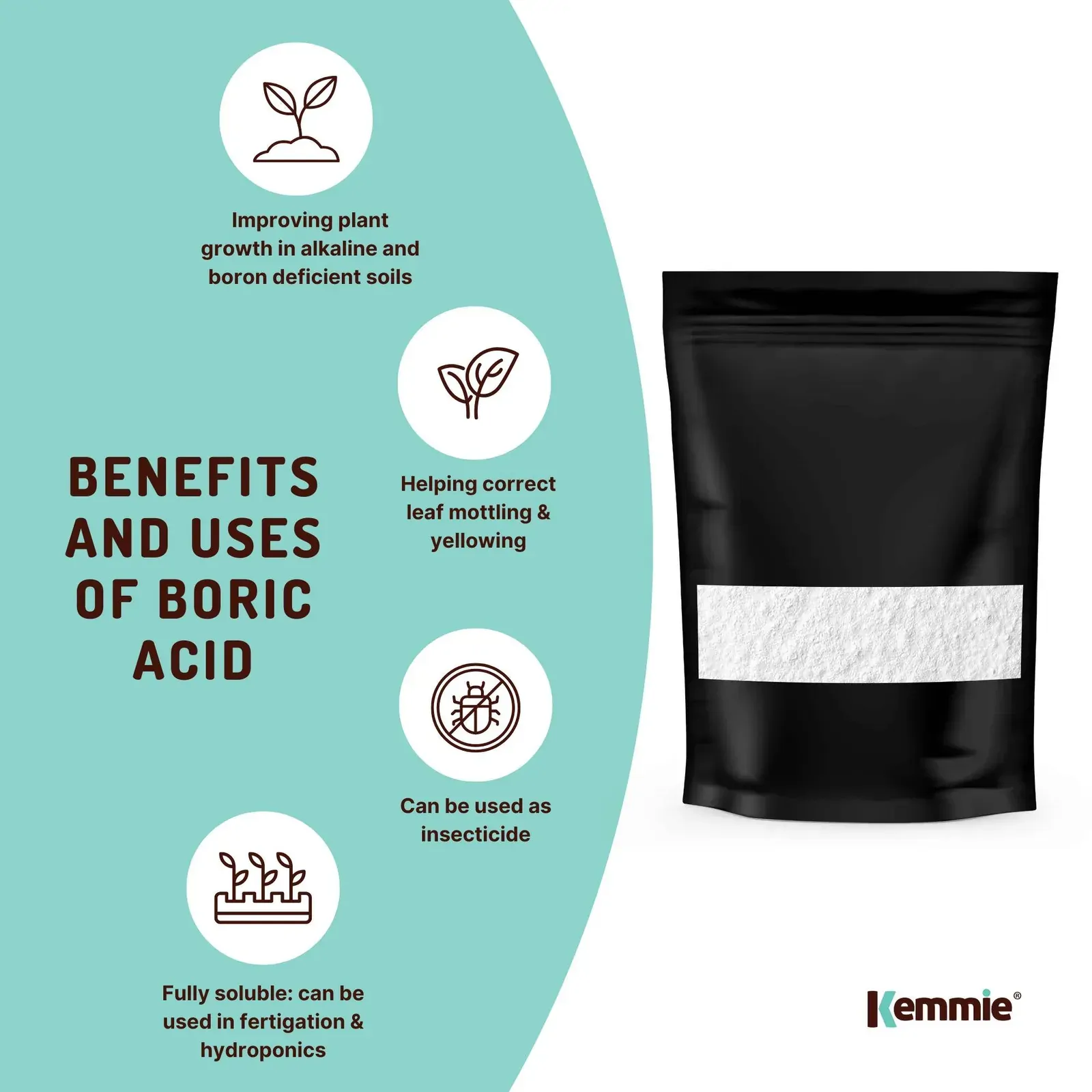 The composition of our Boric Acid is guaranteed to be more than 99.9% H3BO3 and is Fully Soluble, Hydroponics Pest Control.