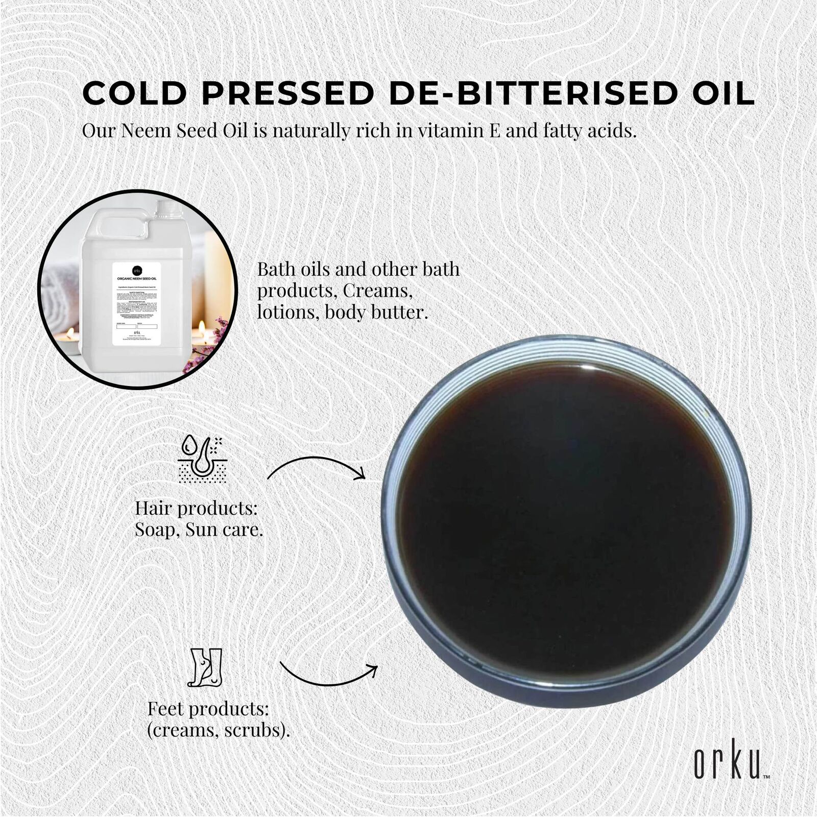 Orku Organic Neem Seed Oil is 100% pure, cold pressed de-bitterised oil with no extractions or additives. It is naturally rich in Vitamin E, contains natural organic Sulphur, proteins, vitamins, glycerine and other trace elements.