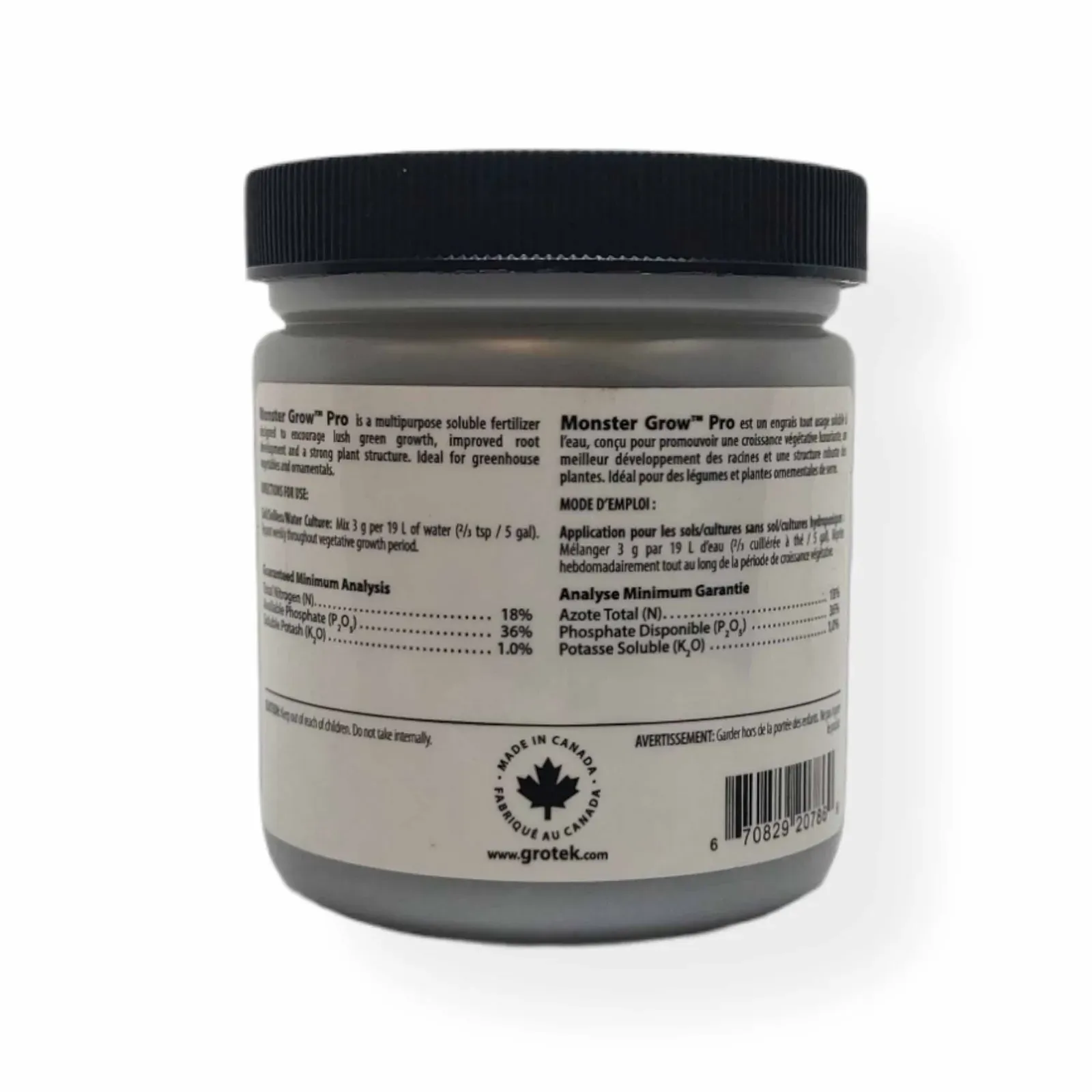 Monster Grow™ Pro is formulated with nutrient ratios to support lush green growth, improved root development, and stronger plant structure. This water-soluble powder contains a blend of mineral and organic nutrients that are essential for vigorous plant growth.