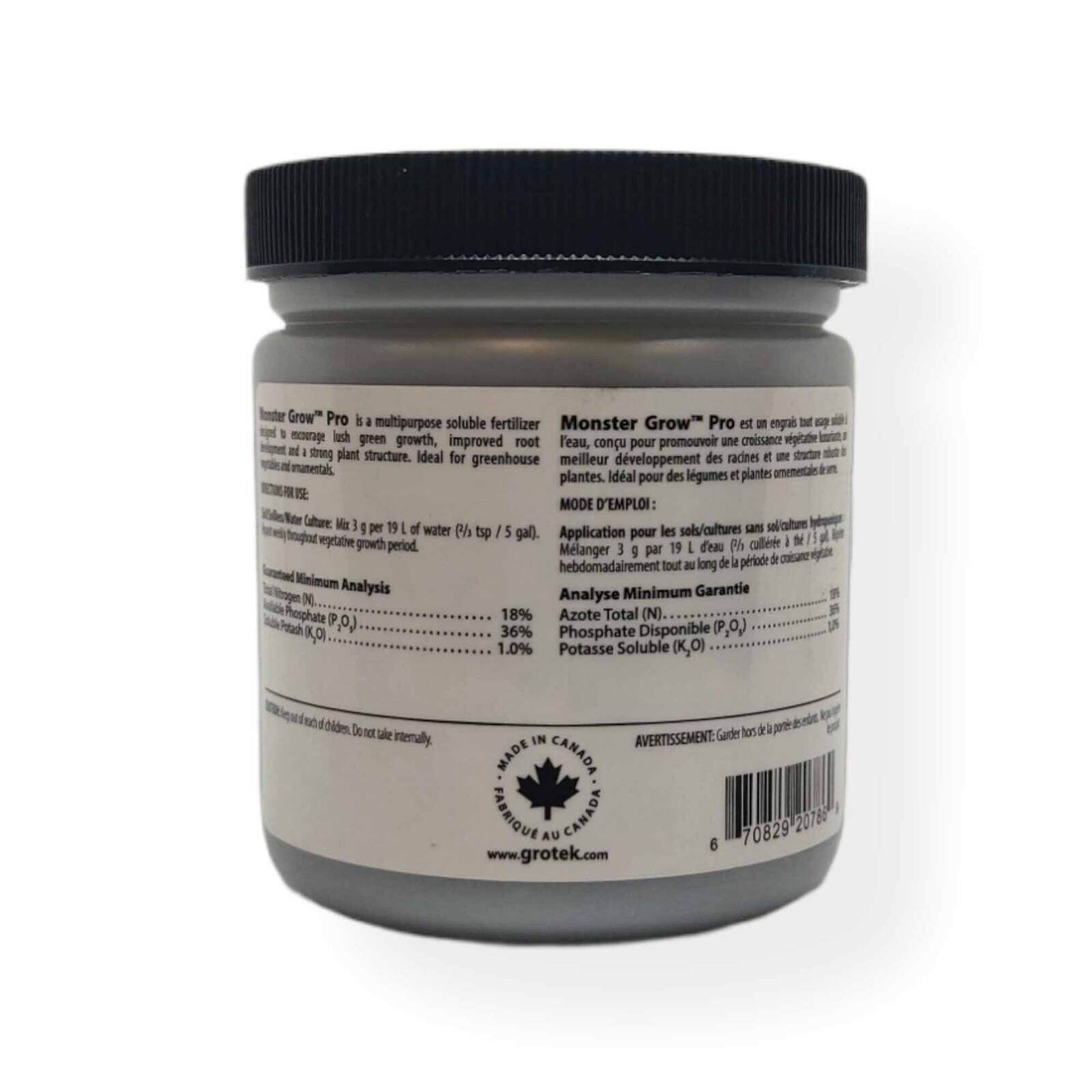 Grotek's Monster Grow Pro is a designed to increase leaf development and push out more roots before flower development. It is a water soluble powder blend of mineral and organic nutrients essential for plant development. This product focuses heavily on root development and overall canopy growth. Quality nitrogen from both mineral and organic sources gives a boost to plant leaf production and size.