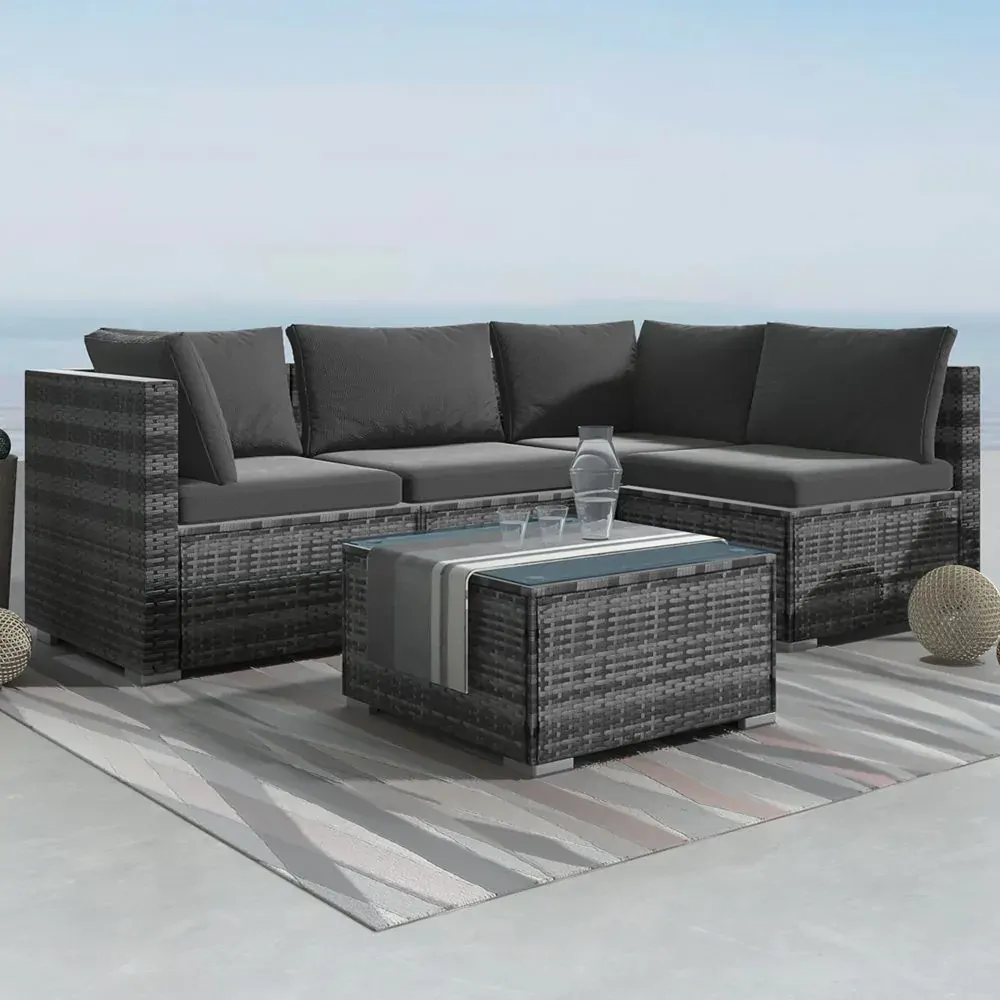 Ultra-modern lines and a beautiful wicker finish makes this unique modular lounge set an incredible addition to any garden, patio or poolside. Designed to bring comfortable living outdoors, and with plenty of room for family time or entertainment, this stylish set seats up to four people at one time. Modular design allows for switching and changing easily, while a coffee table provides additional storage to make the most of your outdoor living spaces.
