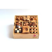Boxed Set of IQ Games The puzzles come with their own storage box with compartments for the 9 puzzles. All the pieces of the various puzzles as well as the storage box are made with monkey Pod wood which is known for its excellent quality and durability. It is 100% natural wood and obtained from socially responsible and sustainable sources. The wood is toxins and odour free and completely safe to be handled by children.