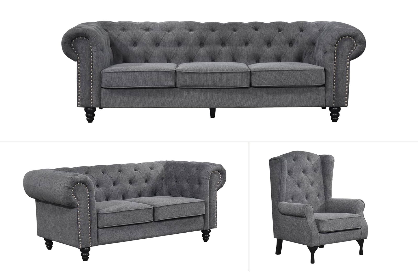 Introducing the Chesterfield Tufted Lounge - Charcoal Grey, a timeless piece of furniture that will add a touch of elegance to any home. This sofa is upholstered in a luxurious beige fabric and features intricate button tufting on the back and sides. The cushioned seat and back provide ultimate comfort, while the zig zag springs and webbing offer support. The solid timber legs add durability, while the hardwood timber frame ensures longevity. This sofa is sure to become a focal point in any living room or lounge.