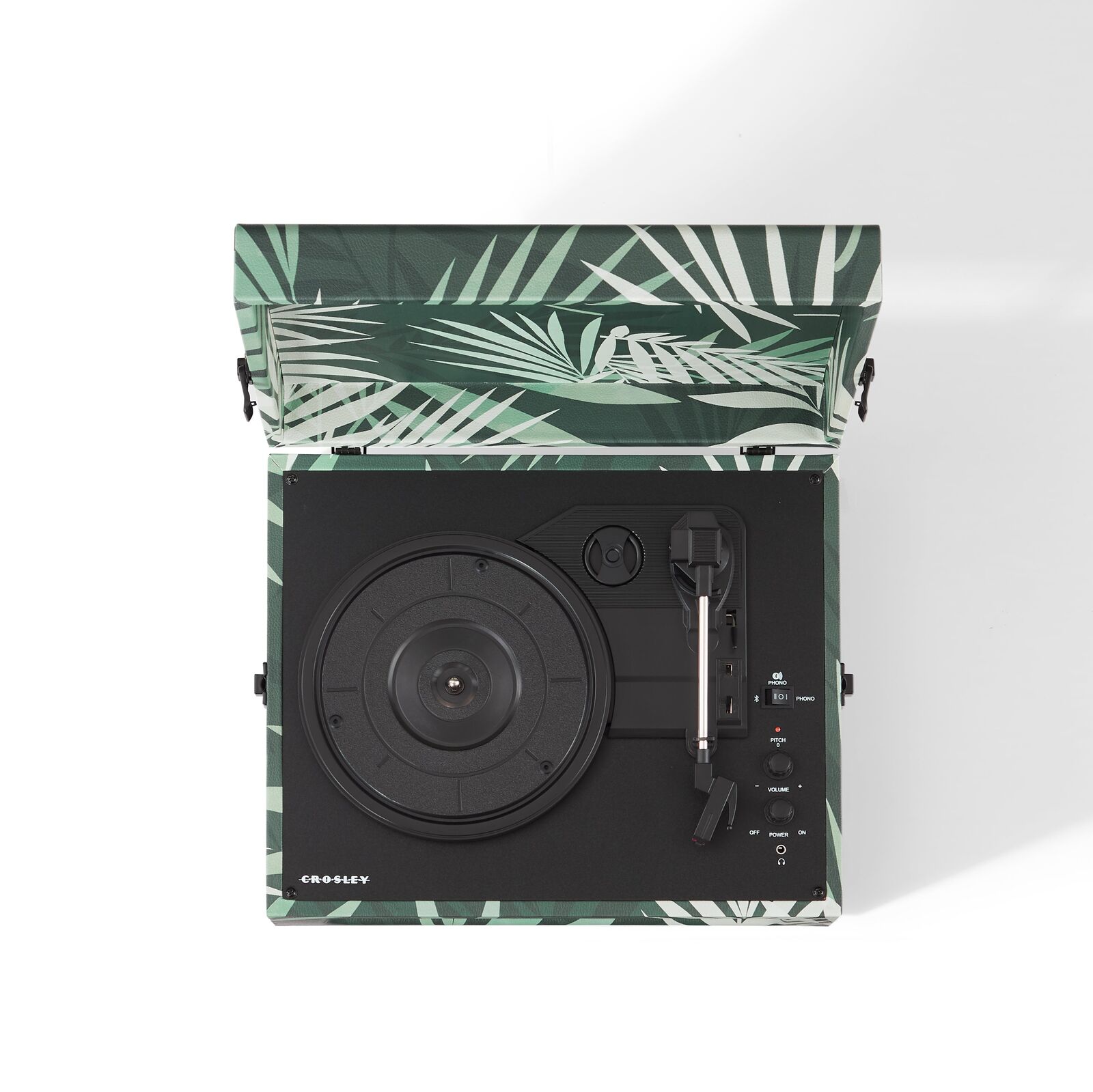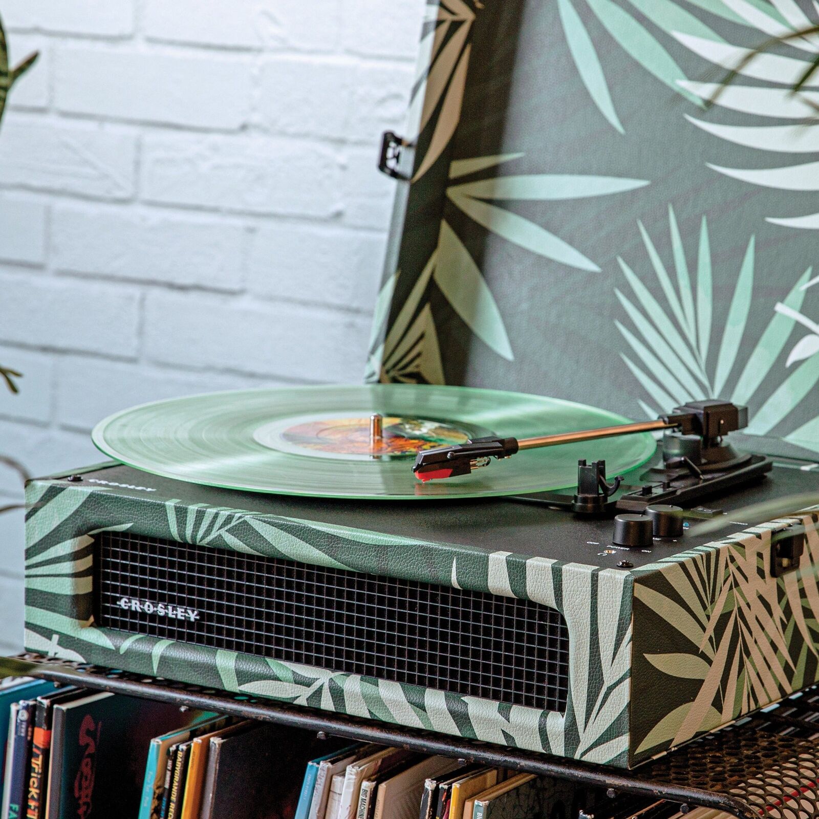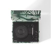 Crosley Voyager Bluetooth Portable Turntable - Botanical + Bundled Crosley Record Storage Display Stand. Join Crosley's mission to bring analogue music to the masses with the Voyager Bluetooth Portable Turntable in Botanical. The clean, vintage-inspired aesthetic fits into any space, while the lightweight design allows this record player to travel “further than anyone, or anything in history.” Spin 33 1/3, 45, or 78 RPM records or launch the built-in Bluetooth transmitter or receiver to send your digital music wirelessly. Discover the RCA outputs on the back that allow you to easily plug into your existing solar music system or bigger speakers to add propulsion to any party. Drop the needle on a reissue of the golden record, probe the adjustable pitch control knob to dial in the speed and prepare for blast off!