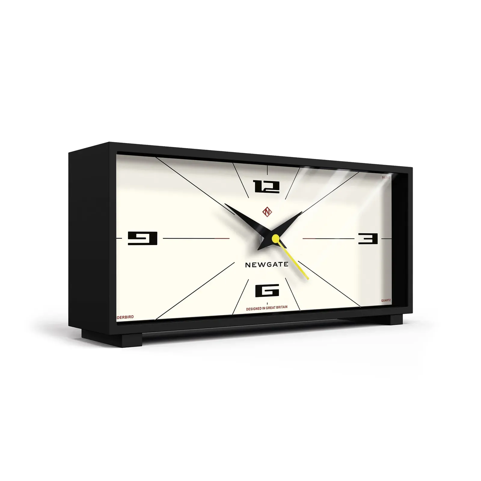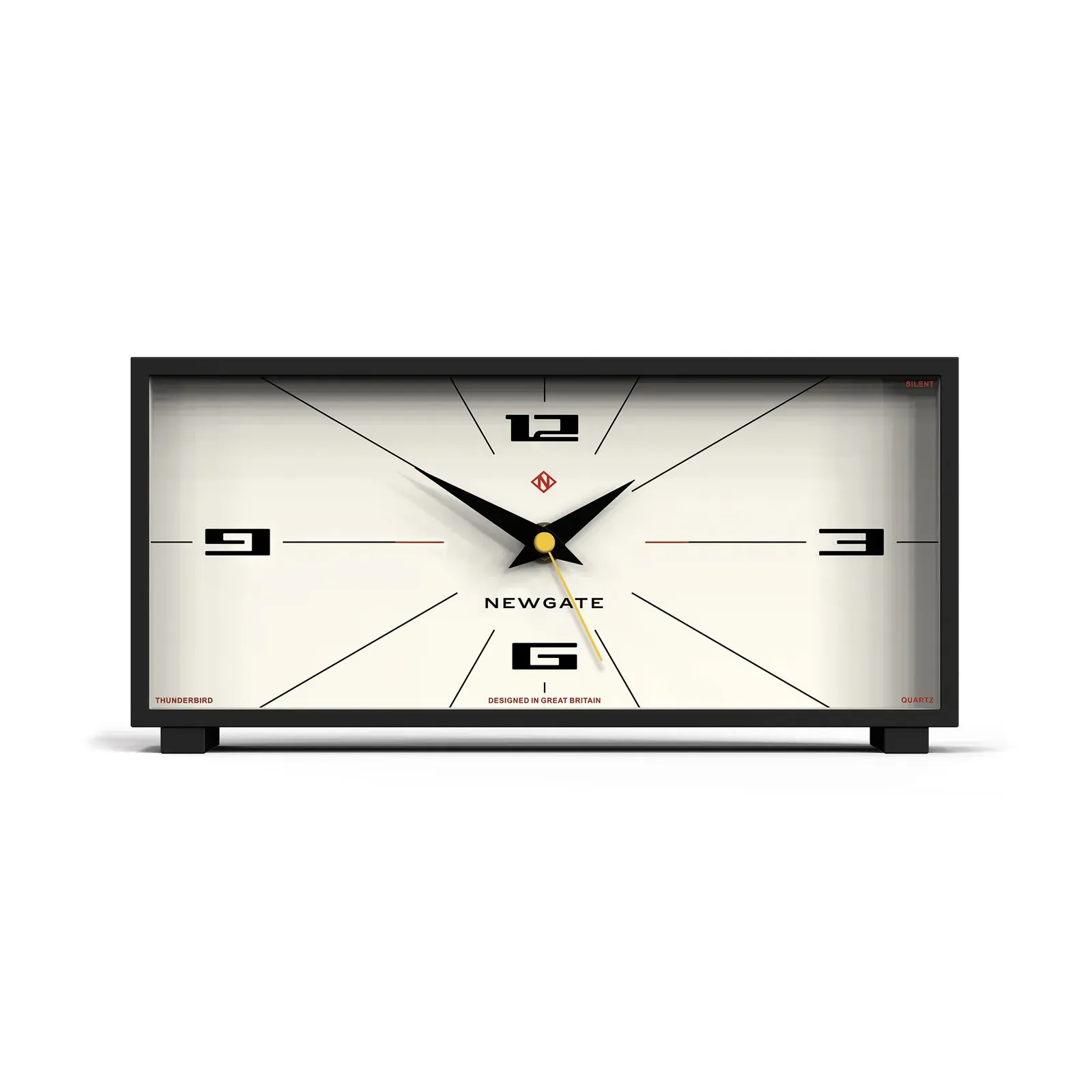 Newgate Thunderbird Mantel Clock Neutral Rocket Dial A mid-century modern mantel clock with an emphasis on the modern. This space-age design blends a contemporary cream face and matt black silicone case with a retro-inspired dial and simplified numerals.