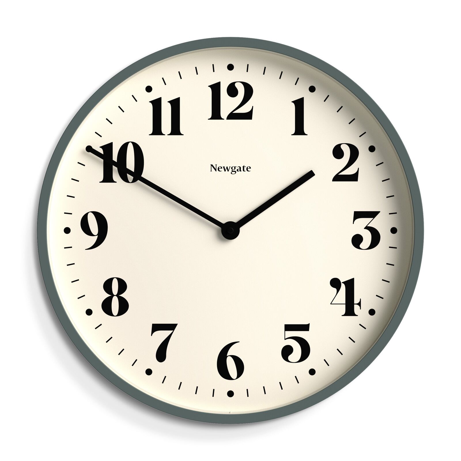The Number Two Wall Clock is a modern 'Asparagus' Green wall clock with a contemporary theatre dial and matt green painted case.