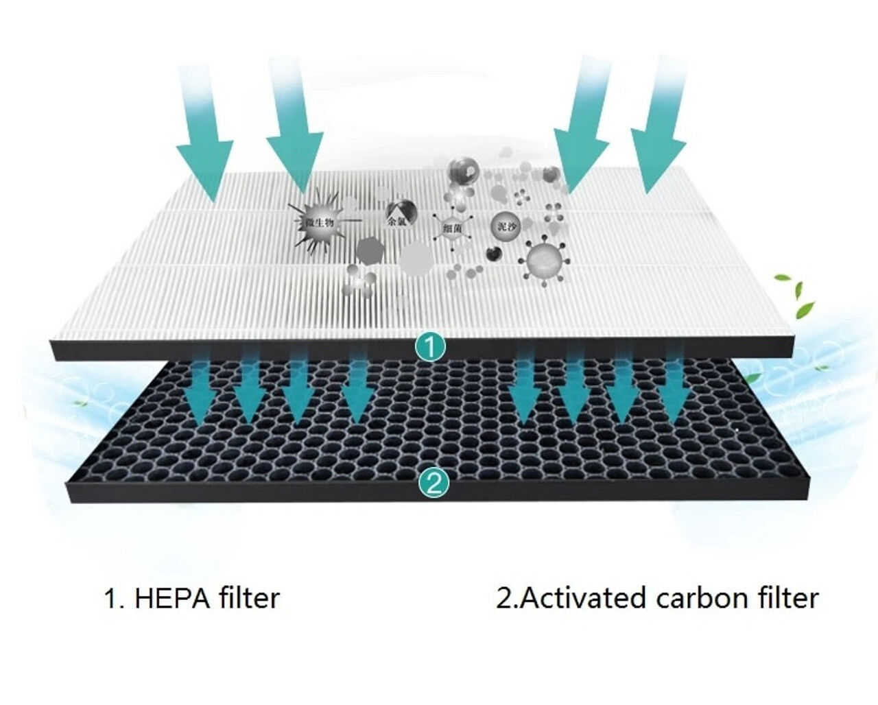 2. HEPA Filter- High performance filter that filters 99.97% of particles to 0.003 of a micron, ensuring protection against bacteria, pollen, dust, viruses, PM2.5 and other particles