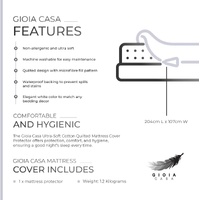 The Ultra-Soft Cotton Quilted Mattress Cover Protector is designed not only to protect your mattress but also to enhance your sleep experience. Its soft cotton fabric, combined with the elegant quilted design, offers luxurious comfort, while the anti-microbial and hypoallergenic properties ensure a clean and healthy sleep environment. The waterproof backing provides peace of mind by safeguarding your mattress from any spills or stains. Invest in this high-quality mattress protector today and enjoy the perfect blend of comfort, protection, and style every night.