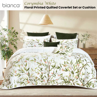 Bring a touch of nature into your bedroom with Corymbia White Floral Printed Quilted Polyester Coverlet Set by Bianca. Featuring a beautiful Australian native corymbia in full bloom with white, grey, pink, and green hues, set amongst an array of tree branches and green leaves. Contrasted on a crisp white background, the soft and simple square quilting pattern makes this the perfect coverlet to snuggle up with. Complete the look with matching accessories.