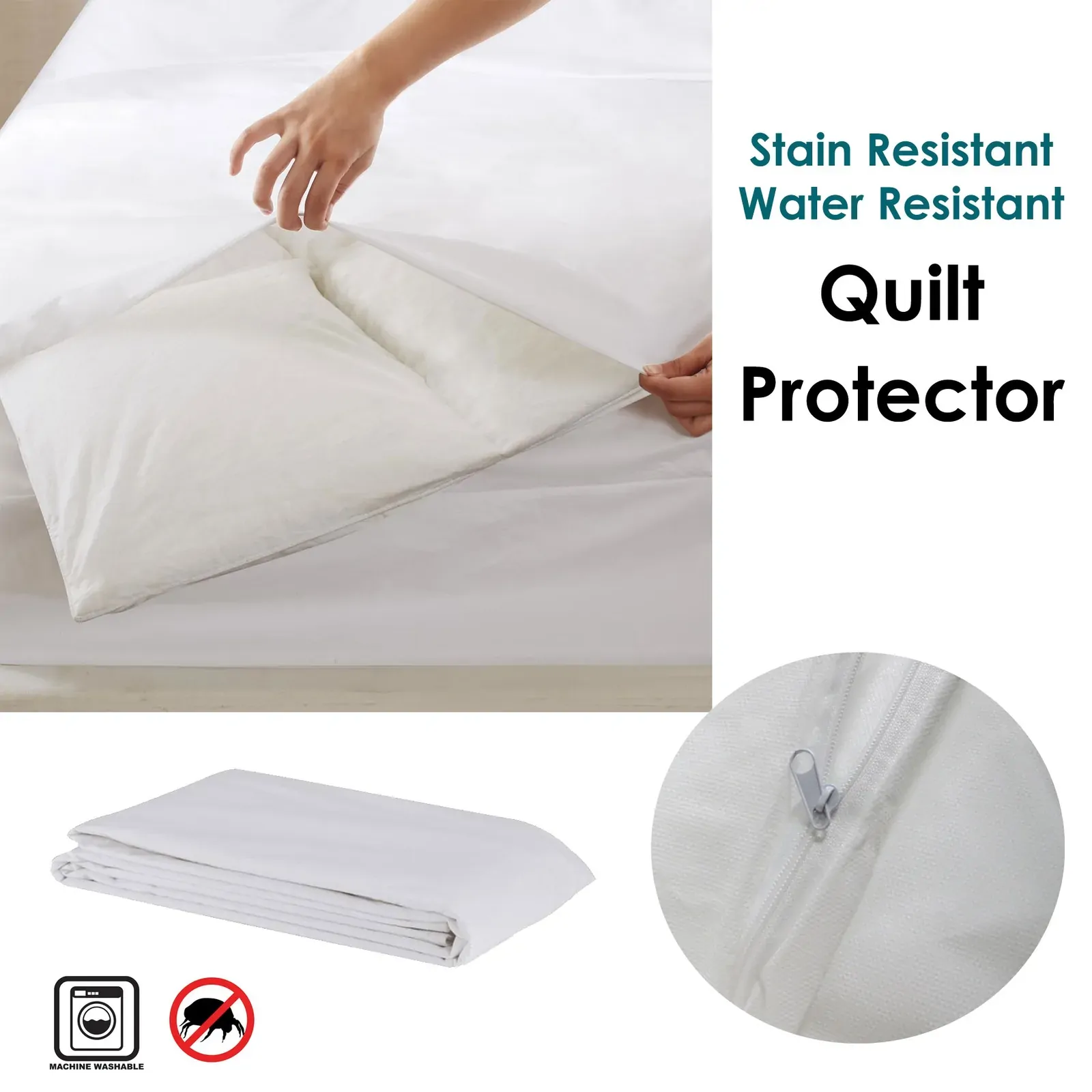 This Stain/ Water Resistant Quilt Protector will protect your quilt from stains, dust mites and allergens keeping your quilt secured. Features solid colour tone design which is perfect for all seasons. With zip opening for easy fitting and machine washable. It is made from high quality Synthetic Fibres material for all-day comfort.
