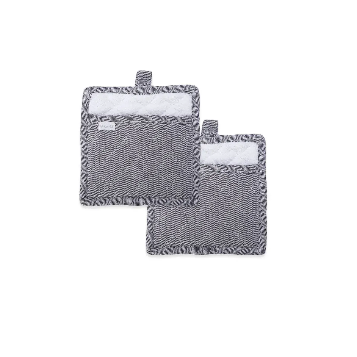 The Herringbone Black Premium Cotton Kitchen Range by Rans comes in shades of white and black, and contains matching Aprons, Oven-Gloves, Double Mitts, Pot Holders, and Duck-mouth Gloves. The Herringbone collection has gorgeous and chic V-shape pattern design. Made from 100% cotton, this padded Herringbone Double Mitts will protect your hands when handling hot pans and baking dishes. It's decorated with a traditional Herringbone pattern in different colours to bring a touch of classic charm to your kitchen, and even features a convenient loop, so when you're done, you can hang your Double Mitts from a hook in your kitchen.