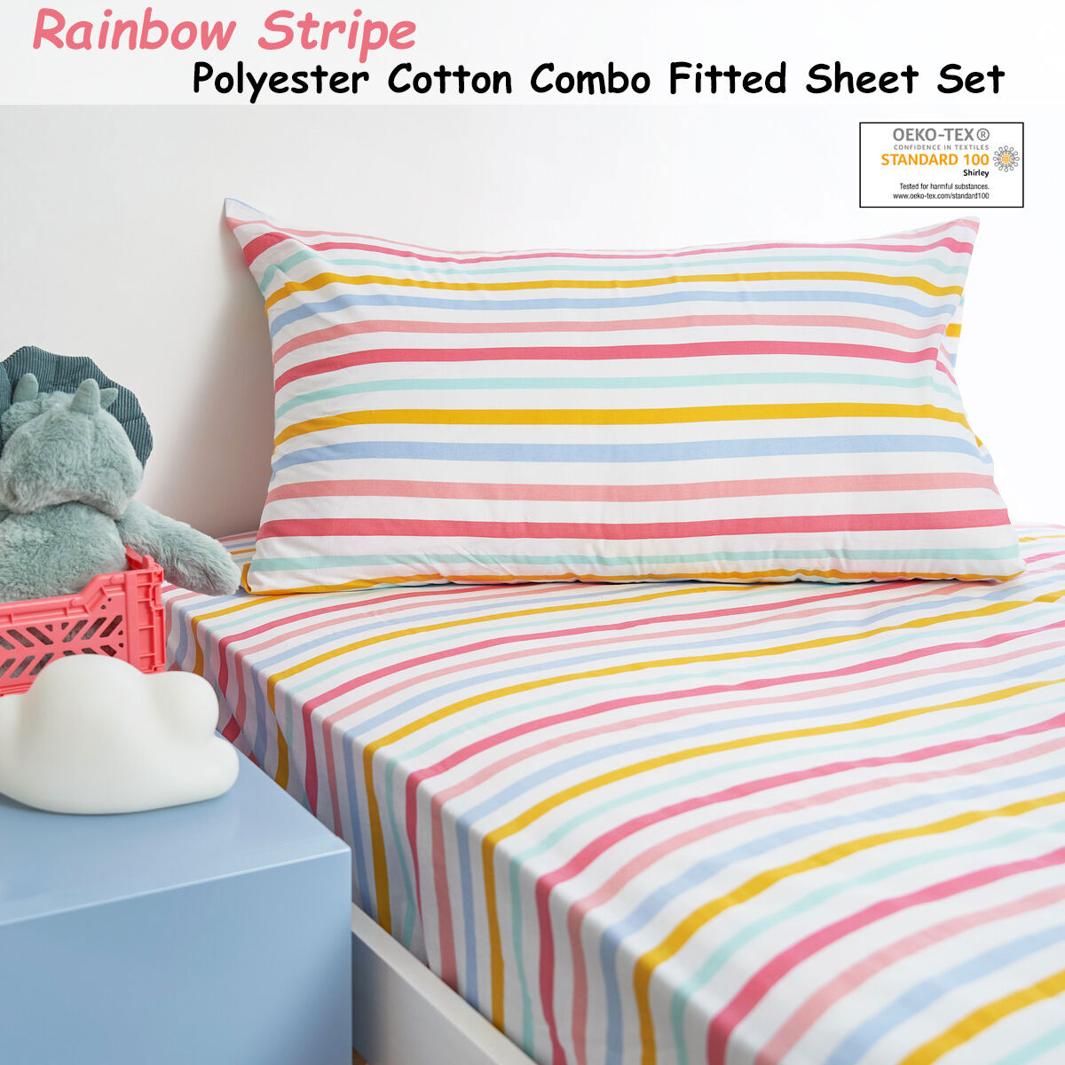 Add extra layer of comfort to your bed with this Rainbow Stripe Polyester Cotton Combo Fitted Sheet Set by Minikins. It features stripes design printed in white, yellow, blue, pink, and green colour tones. Made from Polyester Cotton fabric with 180 thread count and softness you can enjoy all night long. Minikins like to hop, skip, jump, and jive and never go anywhere without a high five. Minikins are so tiny! Always lovely, always nice, Minikins love to be polite. Getting ready for bed, once they've all been fed, Minikins know it's time to sleep. After all that play, at the end of the day, Minikins have to hit the hay.