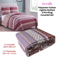 The Seville 3 Pce Lightly Quilted Polyester Cotton Coverlet Set Queen/King is a gorgeous and cosy bedding set that will transform your bedroom into a relaxing oasis. The set comes with a coverlet and two standard pillowcases, made from a soft and lightweight polyester-cotton blend and polyester filling that is easy to care for and comfortable to sleep in. The coverlet features a unique and intricate pattern in shades of white, mauve, purple, burgundy, and brown, creating a rich and elegant look. The Seville 3 Pce Lightly Quilted Polyester Cotton Coverlet Set Queen/King is a beautiful and comfortable bedding set that you will love to snuggle in.