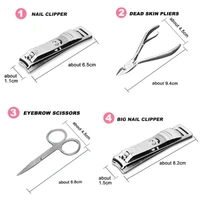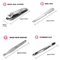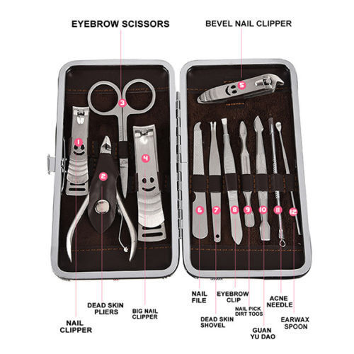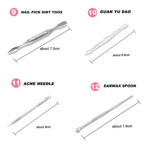 12Pcs manicure pedicure kit: Includes toenail clipper, nail clipper, diagonal nail clipper, multi-purpose scissor, cuticle trimmer, ear pick, single-edged double-sided push stick, eyebrow tweezer, peeling knife, nail file, blackhead needle and loop remover, V-shaped push Stick.