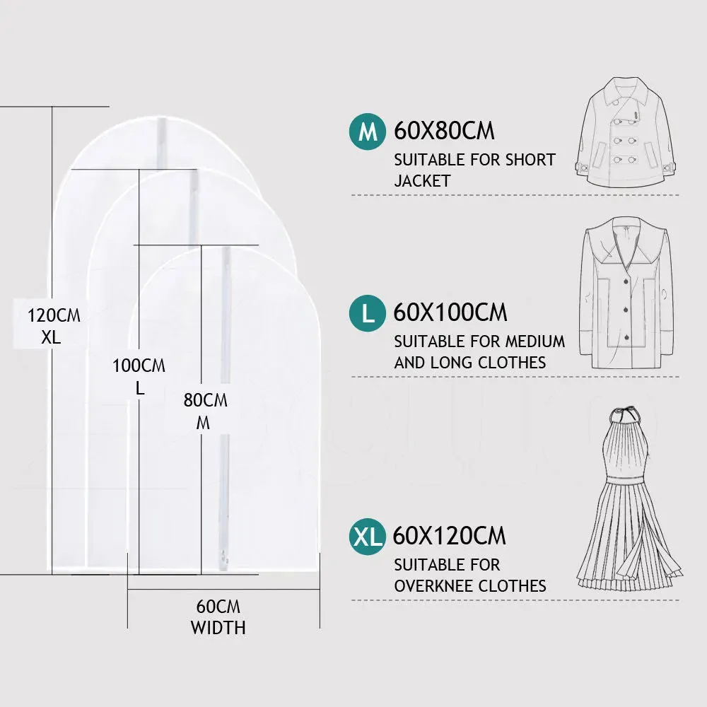 Size Options: The dust cover bags come in four sizes - S: 40x60cm, M: 60x80 cm, L: 60x100 cm, and XL: 60x120 cm, catering to different garment lengths and sizes.