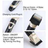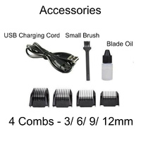 Each set come with cordless clipper, charging cord, small brush, blade oil and 4 different combs.