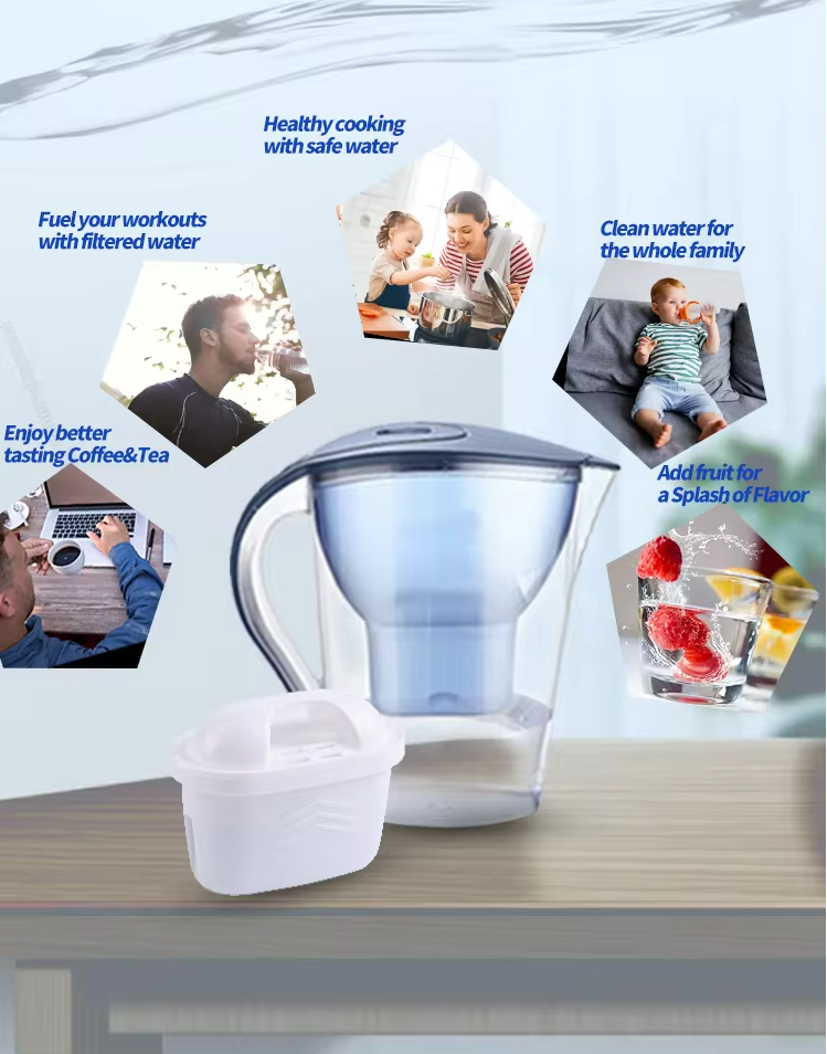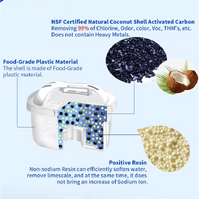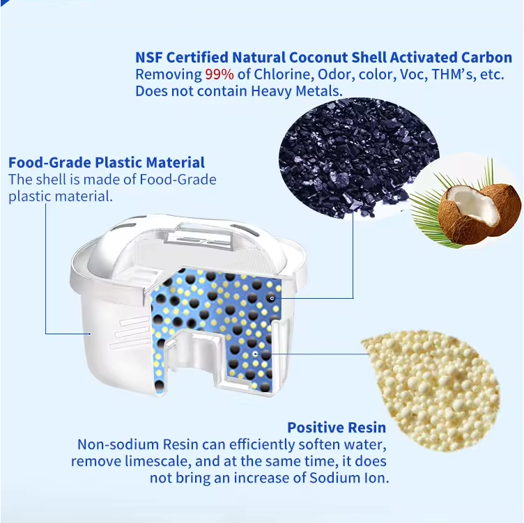 All the material is food grade plastic, the cartridge can filter out the Chlorine, impurities and particular smell in the water. It reduces the water hardness with improving the taste of water for better health.