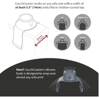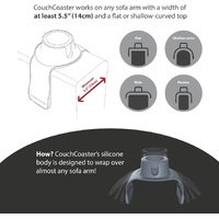 The Couch Coaster features an intergrated mug handle slot and cup adaptor so it can be used forhot and cold drinks, bottles, cans, mugs, glasses,and itfits over flat, curved, wide and narrow chair armsthanks to its clever weighted silicone design.