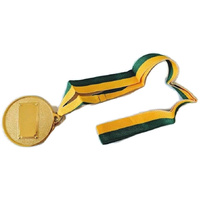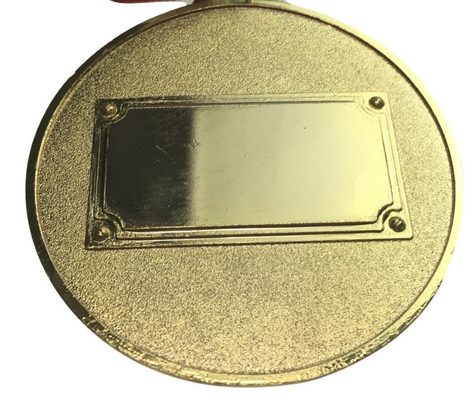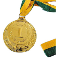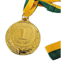 Metal gold medals attached to a green/gold ribbon ready to go on the winners neck! Great for sports days, achievement awards, parties and more! Front of the medal has the number "1" Back of the medal has an engraving plate section!