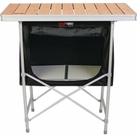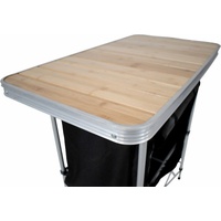The cupboard is mounted inside a sturdy aluminum frame with a weather-resistant bamboo tabletop, so it can be used as a table or kitchen work surface. BlackWolf has designed the Camp Cupboard to fit comfortably inside or outside your tent, and the whole unit can be folded down when not in use for storage or transport.