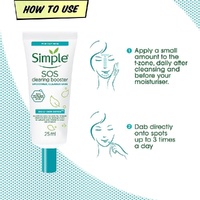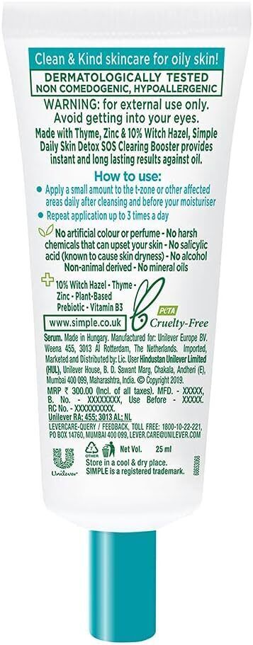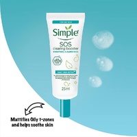 Wondering how to get rid of spots? Simple Daily Skin Detox SOS Clearing Booster is your new instant skin purifier! Following in the footsteps of our award-winning Hydrating Moisturiser, we’ve created our best primer for oily skin prone to blemishes. When skin is exposed to the environment, it can lead to an overproduction of oil and sebum, causing it to become sensitive and prone to breakouts and blemishes. This Simple spot zapper is made with a detoxifying blend of concentrated 10% witch hazel, thyme and zinc; providing long-lasting results against oily skin and blemishes whilst being gentle on your skin. Small yet powerful, with a unique ultra-light gel formula, this face cream is designed to be used in 2 ways: 1) as a primer for all-day shine control on oil-prone areas such as the t-zone 2) as a blemish remover to help reduce redness and soothe irritation. Used daily, this moisturiser for oily skin helps to prevent future blemishes and leaves skin looking visibly clearer, fresh, and balanced day after day. How to use Simple Daily Skin Detox SOS Clearing Booster: 1. Apply a small amount to the t-zone daily after using a facial wash or face cleanser and before applying moisturiser. 2. Dab directly on blemishes up to 3 times a day.