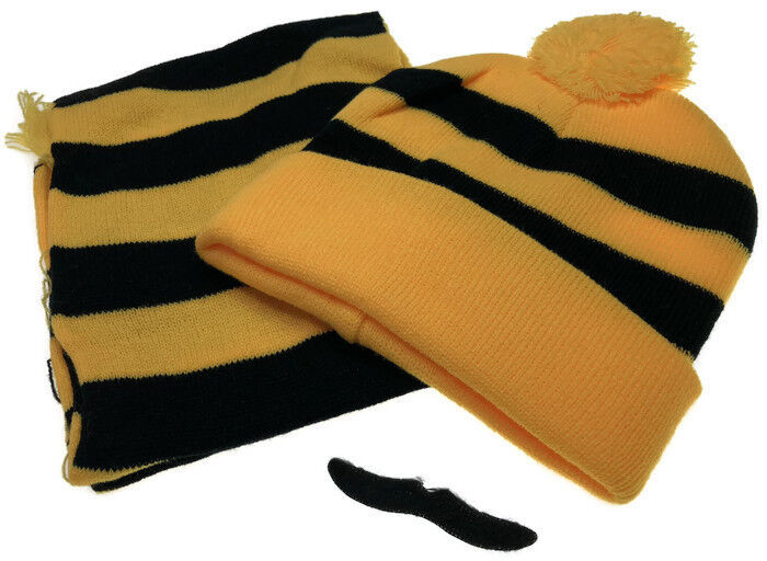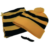 Black/Yellow Striped Beanie and Scarf set with a free moustache for your dress up party or footy game!