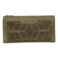 Pierre Cardin slimline soft leather ladies bi fold wallet with snap lock closure features a zip pocket coin compartment, 14 credit card slots, Pierre Cardin hardware embossed Pierre Cardin logo, an ID window slot, silver satin internal lining and