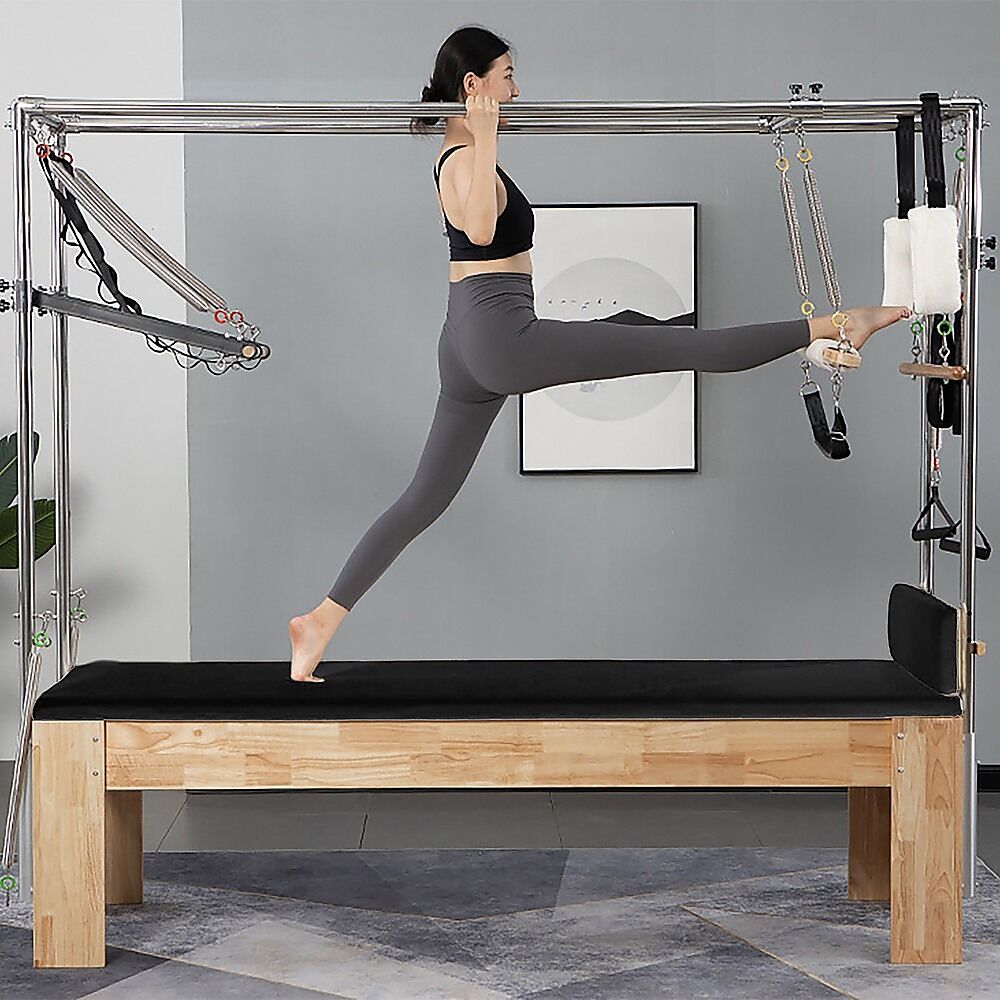 Our Pilates Trapeze Table includes a robust stainless steel trapeze tower, an adjustable push-through bar, a roll-down bar, and trapeze springs - providing maximum versatility for your workout routines. Rest assured, you'll feel secure and steady while engaging in acrobatic workouts. While assembly is required, a comprehensive manual is provided to guide you through the process.