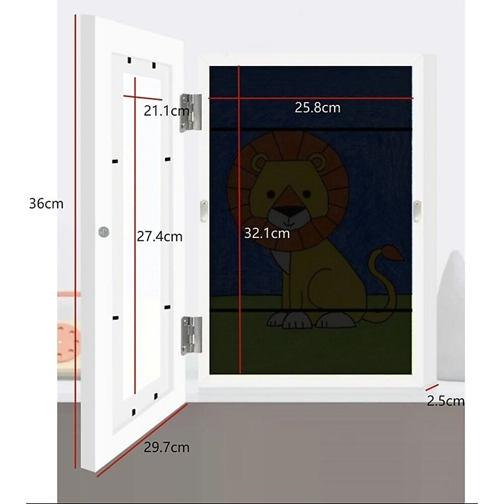Our art frame boasts a 36 x 29.7cm outer border and a 32.1 x 25.8cm inner border, offering an ideal display size for small artworks. It can comfortably store anywhere from 50 to 150 artworks, depending on paper thickness. Crafted with care, our children's art projects feature high-quality glossy acrylic sheets and environmentally friendly MDF frame molding, ensuring a clear view and an artistic ambiance for your pieces.