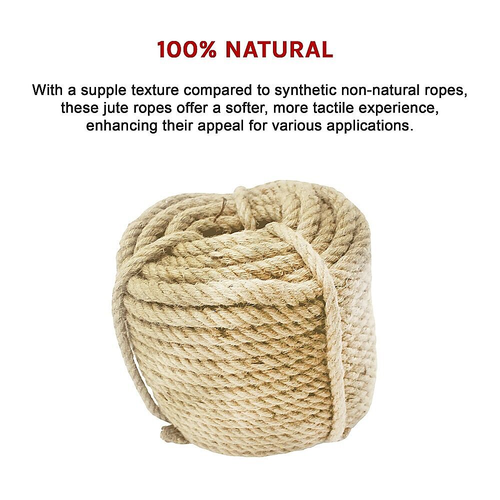 Suitable for an array of tasks including gardening, decking, climbing, swings, handrails, banister rope, decorative rope work, supporting plants, and even cat scratching posts, these ropes offer versatile functionality. Comprising 100% natural jute, they embody an authentic eco-conscious choice.