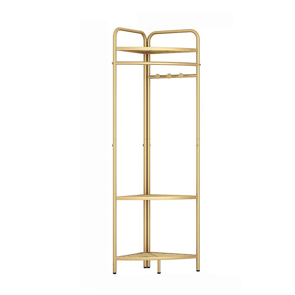 Utilizing corner spaces effectively, this garment rack provides additional storage for both home and office environments. Its modern gold finish makes it a perfect fit for various settings such as bedrooms, living rooms, dressing rooms, laundry rooms, offices, or student dormitories. It effortlessly complements existing furniture and decor, making it an ideal choice for stylish and functional storage solutions.