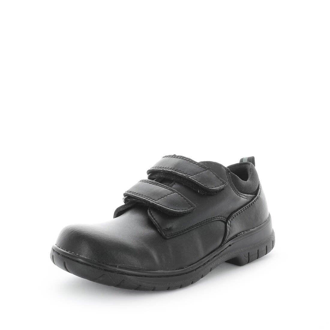 Jacen by WILDE, black double fastener strap junior school shoes. The feature leather upper to help improve breathability. This comfortable pair are fastened offering a custom fit, and a durable lightweight outsole. UK sizes.