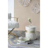 A round side table, stool or foot rest “ introducing the inspired resort side table. Adorned with discs of real sea shells that shimmer when they catch the light, this is a furniture piece that will instantly brighten and transform a space. Invest in a pair as bedside tables, use it as a stool for your desk, or as a stand-alone decor piece to rest a plant on, or even coffee table books