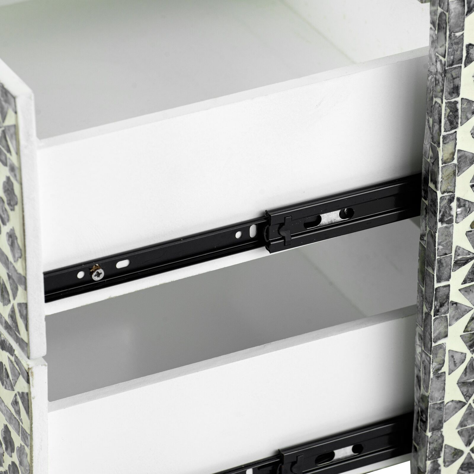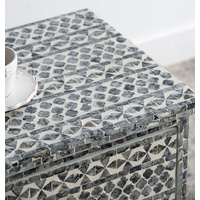 If you are looking for a shell inlay side table that can double as a bedside table, you will find it in our Santa Fe Side Table. Crafted from detailed shell inlay, it is covered with patterned shell pieces that add an air of sophistication. This lovely table features three roomy drawers, a slightly larger and pronounced table top and pedestal legs. The patterned shell design will elevate minimalist, eclectic and boho interiors alike.