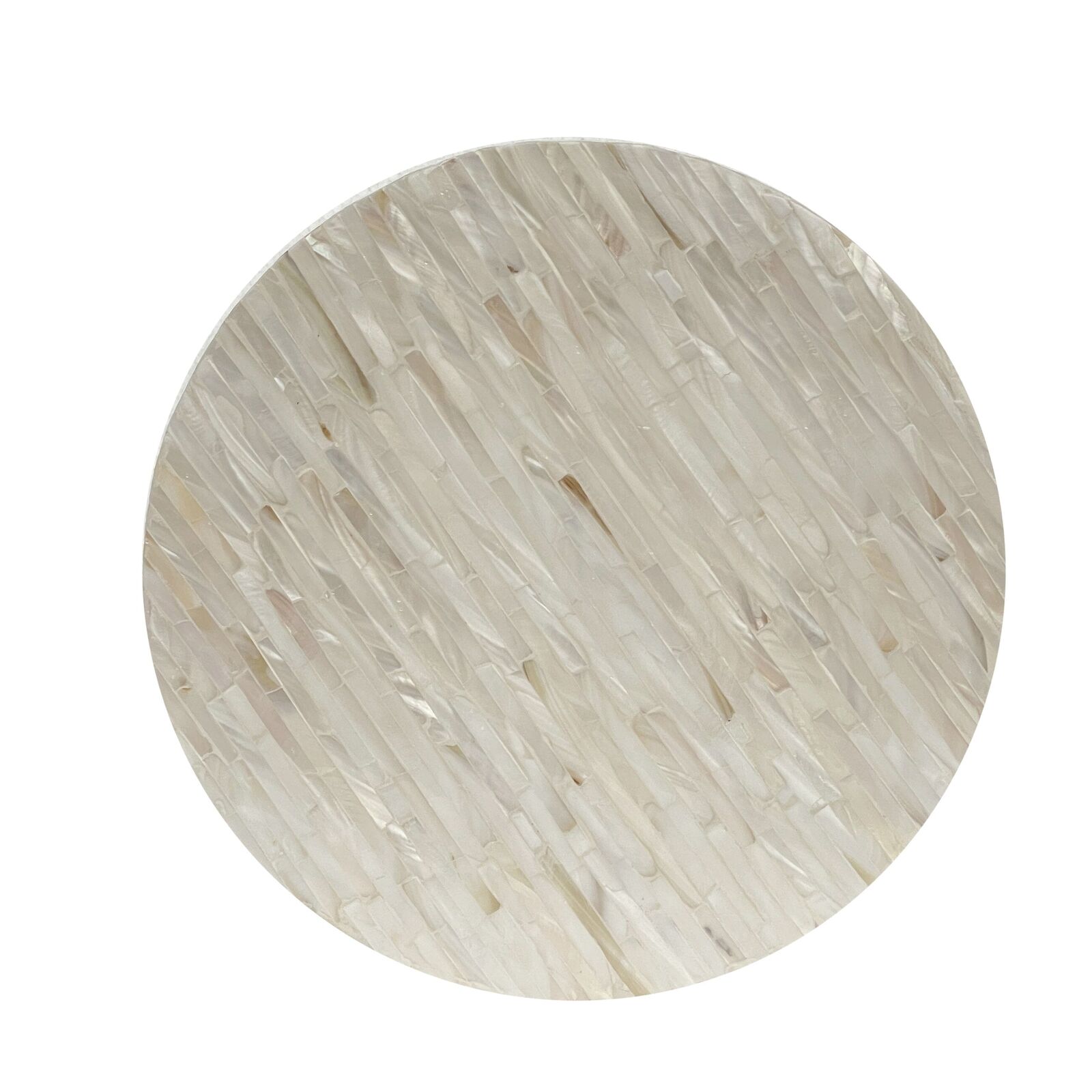 ALPINE MOTHER OF PEARL HAND MADE STOOL/SIDE TABLE It's a truly unique and exquisite piece of furniture. The beauty of nature and human artistry come together in this hand-crafted, mother of pearl stool that doubles as a luxurious side table. Perfect for adding a touch of elegance to any room and starting conversations.