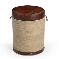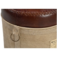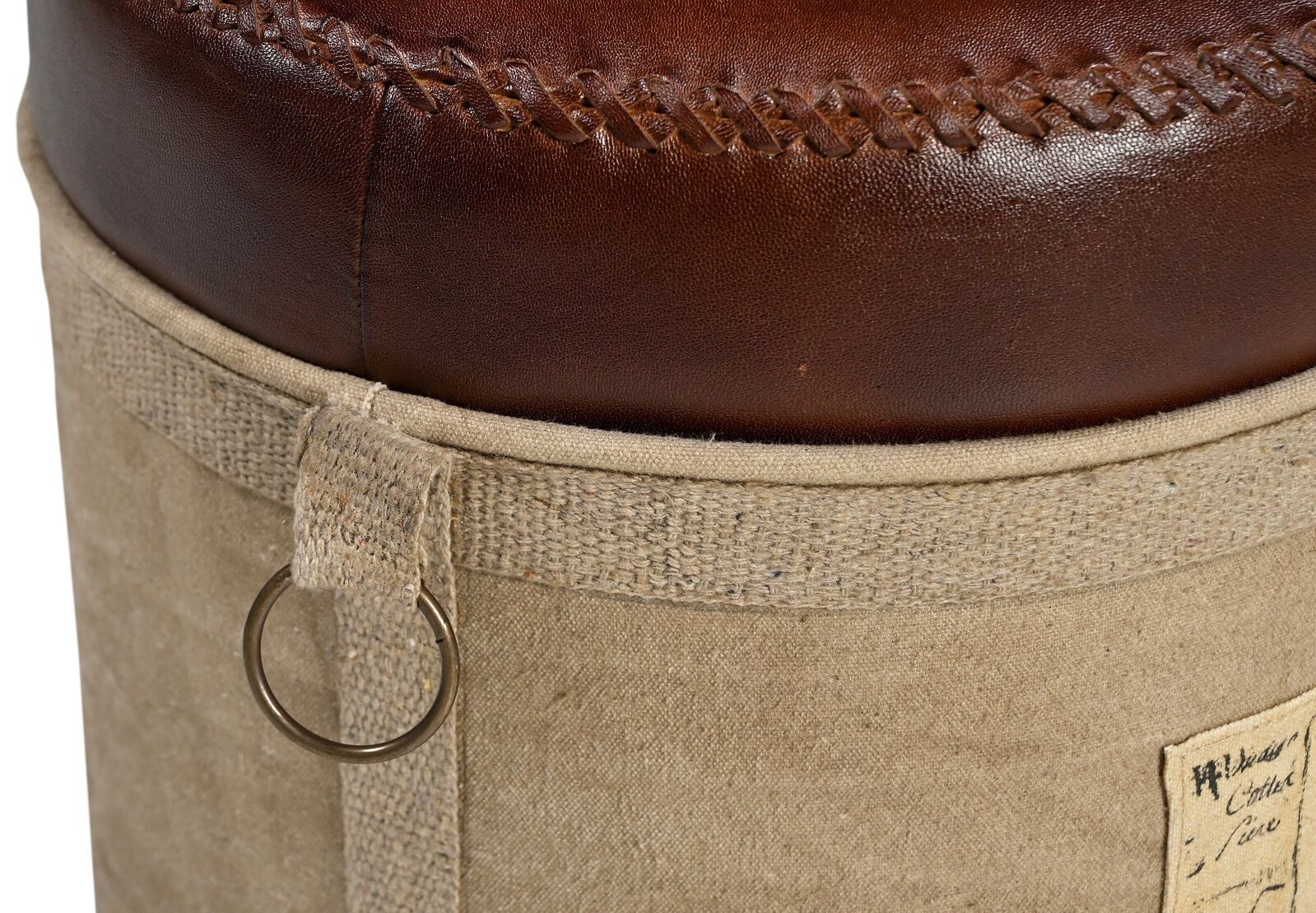 Canvas and leather are an inspired combination in our Cylindrical Chateau Ottoman. The round ottoman features an exquisite leather top, with a canvas base that includes a vintage french motif. This is the perfect addition to your French Provincial collection.