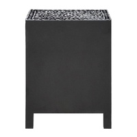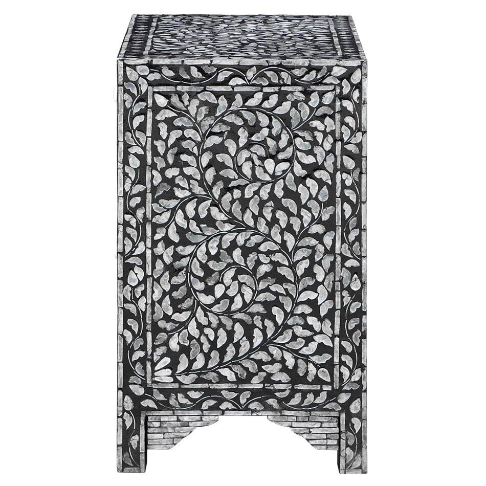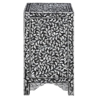 Elegant and inspired, our Jordan shell inlay chest is a furniture piece with a real point of difference. Handmade from original mother of pearl pieces, with a unique floral design, it is boho inspired and features a striking black and cream contrast. Perfect for bedrooms and living rooms alike, this chest consists of a large upper drawer and a lower cupboard, making it an ideal piece for extra storage in a living area or bedroom.