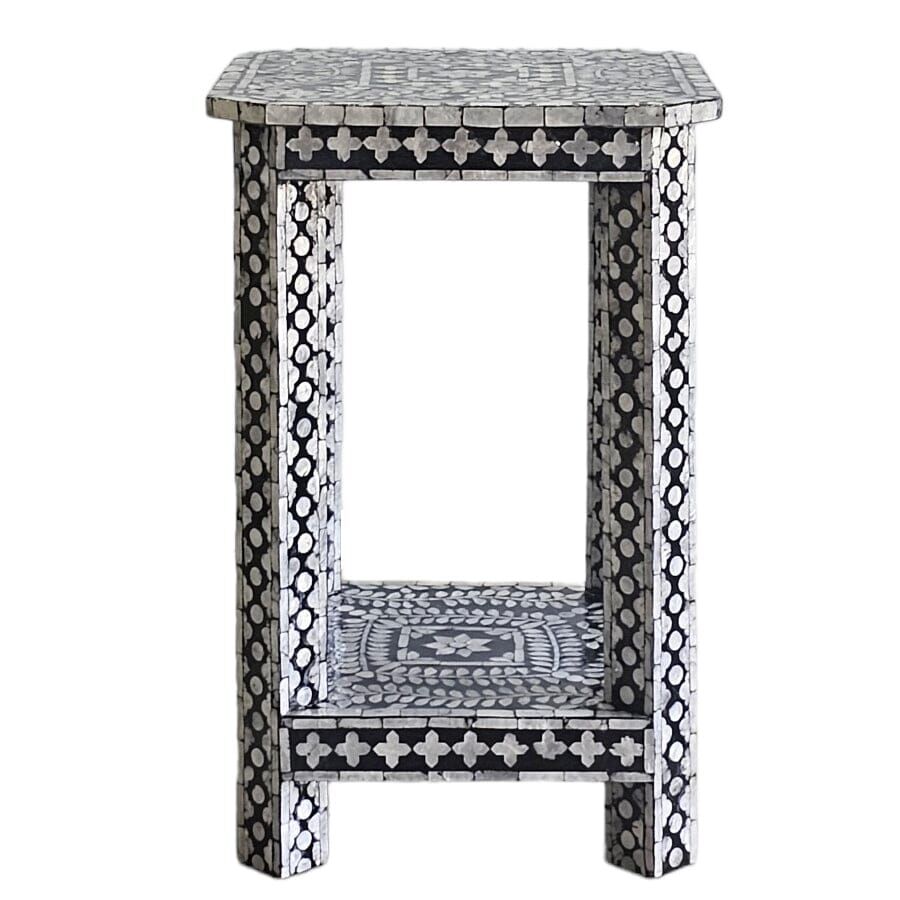 Our hand-crafted Mother of Pearl furniture is expertly crafted, imparting each piece with a unique character of its own. Such pieces may bear small markings, smudges, glue spots, and other subtle details all of which contribute to its one-of-a-kind look. Patterns may differ from those shown in its original photos. Note that these details are not faults and are instead part of the charm of such hand-crafted items. To maintain these pieces, they should not be used outdoors, nor should cleaning chemicals be used. Instead, use a lint-free cloth, and also make sure not to place these pieces near heat or sunlight, as this may cause fading.